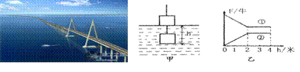 (2)大桥施工时,要向海中沉放大量的施工构件,假设一正方体构件被缓缓吊入海水中(如图甲所示),在沉入过程中,其下表面到水面的距离h逐渐增大,随着h的增大,正方体构件所受浮力F1、钢绳拉力F2的变化如图乙所示。图中反映钢绳拉力F2随h变化的图线是 (填序号)。该正方体构件所受的最大浮力为 牛顿。(海水的密度取1.03×103千克/米3)