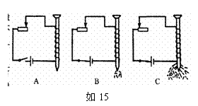 猜想二:通过电磁铁的电流越大,它的磁性越强.为了检验上述猜想是否正确,小红设计了以下实验方案:用漆包线(表面涂有绝缘漆的铜线)在大铁钉上绕制若干圈,制成简单的电磁铁.图15所示的A、B、C为实验中观察到的三种情况.请你根据小红的猜想和实验,完成下面填空: