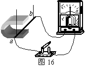如图16所示,在磁场中悬挂一根导体ab,把它的两端跟电流表连接起来。依次进行如下实验,在空白处填写“偏转”或“不偏转”。(3分)