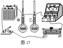 32.图17是用来研究电流通过导体产生的热量跟________的关系的实验装置。两个电阻丝串联是为了控制________不变,闭合开关后,若甲煤油柱上升的比乙高,那么,两瓶中电阻丝的电阻R甲________R乙。(填“大于”、“小于”或“等于”)(3分)