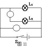 在图10所示电路中的 里填上适当的电表符号,使之在闭合开关S后,完全相同的两灯均能正常发光,并标明两电表的正、负接线柱。(2分)