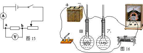 33.如图14所示是研究电流产生热量的多少与什么因素有关的实验装置。装满煤油的两烧瓶甲、乙中电阻丝的阻值R甲>R乙。闭合开关后,发现甲瓶液柱上升的比乙液柱中的高,这表明在 和 相同的条件下,电阻 ,电流产生的热量越多。(3分)