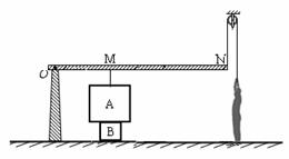 如图19所示,正方体合金块A的边长为0.2m,把它挂在以O为支点的轻质杠杆的M点处,在A的下方放置一个同种材料制成的边长为0.1m的立方体B,物体B放置在水平地面上;OM:ON=1:3。一个重为640N的人在杠杆的N点通过定滑轮用力F1使杠杆在水平位置平衡,此时A对B的压强为1.4×104Pa,人对水平地面的压强为