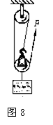 [ ]16.用如图8所示的滑轮组匀速提起重1000N的物体,10s内拉力F移动12m,额外功是800J,下列说法正确的是