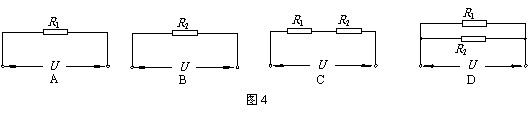 如图4所示的四个电路中,电源两端的电压相同且保持不变,已知电阻R1和R2的阻值大小关系为R1<R2。在这四个电路中,消耗的总功率最大的是 (