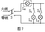 小明在学校上晚自习,照明灯为两盏标有“220V 60W”的灯泡。某天开灯时发现保险丝被烧断,于是找来电工师傅进行检修。他发现电工师傅用一盏标有“220V 40W”的灯泡L0(检验灯泡)取代保险丝接入电路,如图7所示。然后进行了如下操作,并观察到了相应的现象:当只闭合开关S、S1时,L0和L1均发光,但都比正常发光暗;当只闭合开关S、S2时,L0正常发光,L2不发光。由此可以判断( )