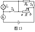 在如图13所示的电路中,灯泡L标有“6V 3W”字样,电源两端的电压和灯丝的电阻均保持不变。当开关S1、S2都断开时,滑动变阻器R的滑片P从b端滑到某一位置c时(图中未标出),滑动变阻器R接入电路的电阻减小6Ω,电流表示数变化了0.1 A,灯泡恰好正常发光。保持滑动变阻器滑片P的位置不变,闭合开关S1、S2,电流表示数又变化了1.5A。当开关S1、S2都闭合时,调节滑动变阻器滑片P的位置(滑片P不接触a端),电路消耗的总功率的最小值为 W。