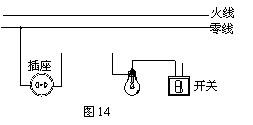 用笔画线代替导线,把带有开关的电灯、插座分别正确地接入图14所示的家庭电路中。