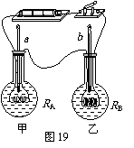 30.小明在探究电流通过导体产生的热量与哪些因素有关时,把两段金属丝A、B(已知A、B两金属丝的电阻分别为RA、RB,且RA<RB)串联后,分别放在如图19所示的两个完全相同的烧瓶中并接入电路,在烧瓶中加入质量、初温均相同的煤油,再分别插入相同的温度计a、b。闭合开关通电一定时间。此方案可探究电流通过导体产生的热量与____________大小的关系。 请你应用所学知识推断实验过程中_______瓶内煤油的温度升高得更快(选填“甲”或“乙”)。
