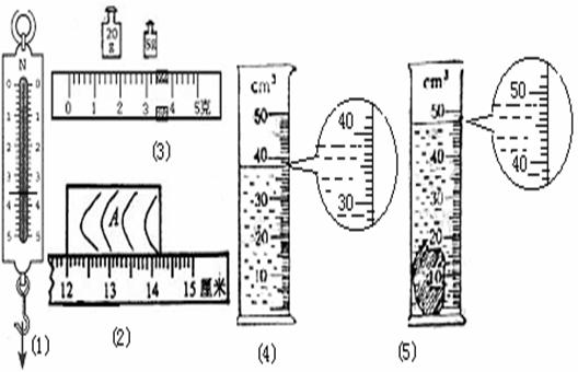 19、读出下图填空(每空1分共7分)(1)中弹簧秤拉力的大小为 ;(2)中物体的长度为 ;(3)表示用天平称某物体质量时,天平平衡时砝码数值和游码位置,则物体的质量为 ;(4)量筒中水的体积为 ,加入物体后水和物体的总体积如图(5),总体积为 ,则物体的体积为 。如果这个物体和图(3)中的物体是同一个物体,则它的密度为 。