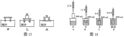 在探究“压力的作用效果跟什么因素有关”的实验中,某同学做了如图15所示的实验,比较甲、乙两图可得压力的作用效果与