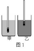 小明在一根均匀木杆的一端缠上少许铜丝,使得木杆放在液体中能竖直漂浮,从而制成一支简易密度计。小明将它分别放入甲、乙两种不同液体中,静止后如图1所示。若两种液体的密度分别为