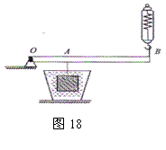 27.小杰同学发现了一个金属块,他想知道它的重力和密度.他手中只有一只量程较小的弹簧秤,当他用此弹簧秤测量此金属块的重力时.发现已超过弹簧秤的最大量程,于是他设计了如图18所示的装置去测量。图中OA:OB=1:3,用细绳把金属块悬挂于A点,用弹簧秤在B点施加一个竖直向上的力,当OB杠杆水平静止时,弹簧秤读数为1.8牛.当向容器中加水,金属块浸没于水中后,弹簧秤读数为1.2N,g取10N/kg。