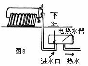 (4)冬天受自然条件影响,太阳能热水器内的水温较低。一天,小华和小明测得水温约40℃左右,若用此水淋浴显然温度较低,他们设计了一个方案,把太阳能内的温水送到电热水器中加热后再使用,这样可节约能源。他们从电热水器铭牌上查得:进水口压强P≥0.2Mpa。若电热水器安装在小明家,如图8所示,通过计算说明此方案是否可行。(液体内部压强公式P=ρg h ,g取10N/kg ,1MPa = 1000000 Pa)