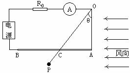 32、如下图是一种测定风作用力的仪器示意图。质量m=0.8Kg金属球用质量很轻的细金属丝OP悬于O点。AB为一根水平放置的电阻丝,它与金属丝始终保持良好接触。R0 =10Ω是电路保护电阻,已知AB=10cm,且单位长电阻λ=2Ω/cm,OA=5cm,无风时细金属丝自然下垂在A点与电阻丝接触,这时电流表示数为0.5A,有风时细金属丝将发生偏转,已知偏角θ与风力F满足F=mg tgθ(g取10N/kg),求: