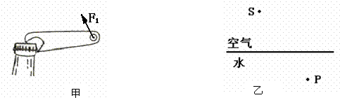 11.(3分)如下图乙所示,一激光灯从点S发出的一束射向水面的光,在界面发生反射和折射,折射光线经过P点。请你在图中作出大致的入射光线及其相应的反射光线和折射光线。![]()