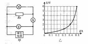 (6分)某物理兴趣小组同学设计了如图(甲)所示的电路图进行实验探究,电源为可调压直流学生电源,电压表量程为“0-15V”流表量程为“0-0.6A”,小灯泡标有“6V 1.2W”字样,Ro为20Ω的定值电阻.小组根据记录的电流表和电压表示数变化,描绘出U-I关系图,如图(乙)所示.