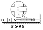 29.如图所示,把弹簧测力计的一端固定在墙上,另一端拉着放在光滑水平地面上的金属块,用力F水平向左拉金属块,此时测力计的示数稳定(图中已把弹簧测力计的示数放大画出),则拉力F大小是 ▲ N.该弹簧测力计的最小刻度值是 ▲ N.
