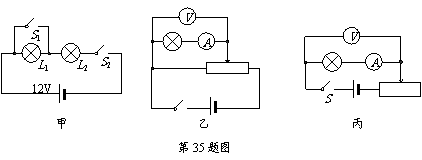 35.同一型号的两个灯泡串联在电路中会一样亮吗?小明在进行电学实验时发现了有趣的现象.实验时,小明将两个型号为“12V 25W”的灯泡L1和L2接到12V电源上,组成如图甲所示的电路并进行如下操作:①首先,断开开关S1,闭合开关S2,发现两个灯泡一起变亮,亮度相同;②接着,保持闭合开关S2,再闭合开关S1,发现灯泡L1因短路而熄灭,灯泡L2变得更亮;③等到L1熄灭一段时间后,又断开开关S1,发现L2的亮度逐渐减弱,而L1逐渐亮起来,过了一会儿两个灯泡达到一样的亮度.为什么步骤③中会出现这种有趣的现象呢?小明猜想可能是因为灯泡两端电压变化后,造成灯丝电阻变化所致.为了检验自己的猜想是否正确,小明取其中一个灯泡,重新设计电路,将开关闭合后,测得了灯泡两端的电压和灯泡中的电流,实验数据如下表所示.