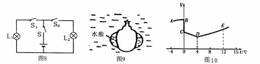 19.如图10所示,是一定质量的某种晶体体积随温度变化的图像,分析图像可知:这种晶体的熔点是 ▲ ℃;D点的密度 ▲ E点的密度.(选填“大于”、“等于”或“小于”)