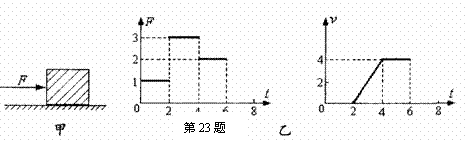 23.如图甲所示,放在水平地面上的物体受到方向不变的水平推力F的作用,F的大小与时间t的关系和物体运动速度v与时间t的关系如图乙所示。由图像可知,当t=1s时,物体处于_______________(选填“静止”、“匀速运动”或“变速运动”)状态;当t=3s时,物体受到的摩擦力为___________N。