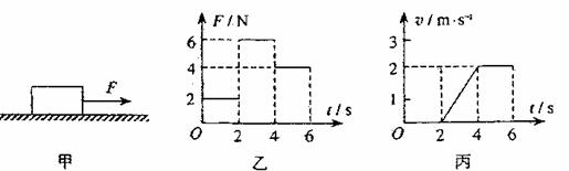 25. 如下图甲所示,放在水平地面上的物体,受到方向不变的水平拉力F的作用,F的大小与时间t的关系如图乙所示,物体运动速度v与时间t的关系如图丙所示,由图象可知,当t=1s时,物体受到的摩擦力为___▲___,当t=5s时,物体的速度为___▲___。