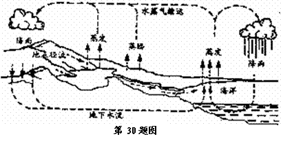 30.如图是关于水循环的示意图.地球上的水在不停地循环着.阳光晒暖了海洋,水变成水蒸气升到空中,形成暖湿气流.暖湿气流遇到冷空气后水蒸气液化成小水滴,变成雨.天空的降水落到地面,一部分直接变成小溪,另一部分渗入地下,涌出地表后,变成股股清泉.许多小溪汇合,形成江河,又注入大海.