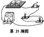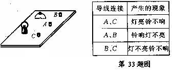33.某电路中有一个封闭的电路盒(如下图),面板上有A、B、C三个接线柱及灯泡、电铃各一个.为了探究盒内电路结构,小明做了多次实验,实验结果记录如下表.根据实验情况,请你在虚线框内画出电路盒内的电路图.
