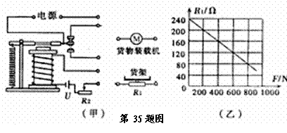 小明设计了一种“自动限重器”,如图(甲)所示.该装置由控制电路和工作电路组成,其主要元件有电磁继电器、货物装载机(实质是电动机)、压敏电阻R1和滑动变阻器R2等.压敏电阻R1的阻值随压力F变化的关系如图(乙)所示.当货架承受的压力达到限定值,电磁继电器会自动控制货物装载机停止向货架上摆放物品.已知控制电路的电源电压U=6V,电磁继电器线圈的阻值忽略不计.请你解答下列问题: