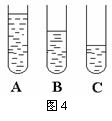 质量相等的水、硫酸、酒精(知ρ硫酸>ρ水>ρ酒精),分别装在规格相同的A、B、C三个试管中,如图4所示,则可判断出