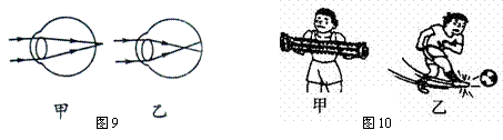 全国中学生体质健康调研数据表明:中学生近视发生率约为55.22%,且急剧低龄化。如图9所示,表示近视眼折光系统的光路示意图是 图(选填“甲”或“乙”),矫正近视眼应佩带 (选填“凸”或“凹”)透镜制成的眼镜片。