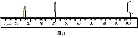 在“探究凸透镜成像规律”的实验中,小刚同学用焦距分别为5cm、10cm、15cm的凸透镜做实验,实验装置如图11所示。将蜡烛放在15cm处,在实验过程中始终保持蜡烛和凸透镜位置不变,请你根据所学知识完成下列填空。
