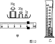 小明在实验室测量金属块A的密度。小明先用调节好的天平测量金属块A的质量。天平平衡后,右盘中所放砝码及游码在标尺上的位置如图12甲所示,则金属块A的质量为 ______g。然后,小明将金属块A放入盛有50ml水的量筒中,量筒中的水面升高到如图12乙所示的位置,则金属块A的体积为 cm3。由此可计算出金属块A的密度为 kg/m3。
