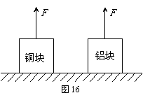 铜块和铝块,都是边长为10cm的正方体,放在水平地面上,当以相同的力F竖直向上拉两个金属块时(如图16所示),铜块对地面的压力N1与铝块对地面的压力N2之比为32∶1。(已知:ρ铜=8.9×103kg/cm3,ρ铝=2.7×103kg/cm3)。求:拉力F 的大小(g取10N/kg)。