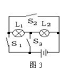 15.在图示3的电路中,要使灯L1、L2串联需要闭合的开关是_____;要使L1、L2并联,需要闭合的开关是_____;此电路绝对不能把_____两个开关同时闭合。