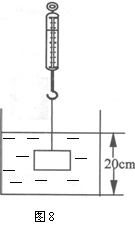 23.如图8所示,放在水平桌面上的薄壁圆柱形容器重2N,弹簧测力计的挂钩上挂着重为4N、体积为100cm3的物块,现将物块浸没水中,容器内水面由18cm上升到20cm(g=10N/kg)。求: