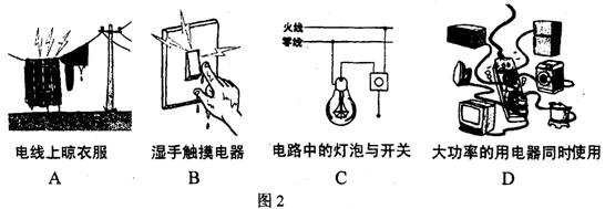 6.如图2所示的情景中,符合安全用电原则的是 ( )