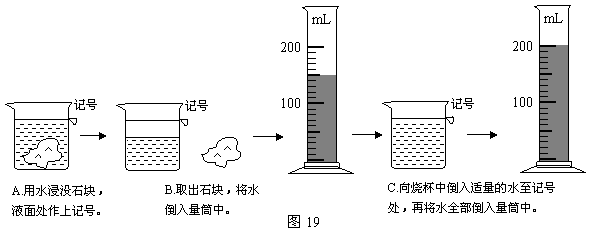 (2)因矿石的体积较大,放不进量筒,因此他利用一只烧杯,按图19所示的方法进行测量,矿石的体积是 cm3。(1分)