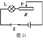 20.如图21所示,标有“6V 3W”字样的小灯泡与最大阻值为30Ω的滑动变阻器串联在电路中。当变阻器连入电路中的电阻为12Ω时灯正常发光。(不考虑灯泡电阻受温度影响,电源电压不变)求: