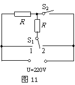 如图11所示,电源电压为220V,S1为单刀双掷开关,两根相同的电阻丝R上标有“220V,200W”字样。