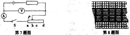 7.如图所示电源电压不变。S闭合后移动滑片分别至端点a、b、中点c和端点d,小明同学记录了在这四点时电流表、电压表的示数,在记录的时候他虽然正确地进行了记录,但顺序却弄乱了,这八个数据分别是:3V、4V、0V、2V和0.4A、0.2A、0.3A、0.6A,那么滑片在b点时,电流表、电压表的示数应该是:( )