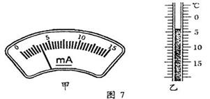 16.. 如图7甲所示的电流表读数为_______。如图7乙所示的温度计读数为_______。(共2分)