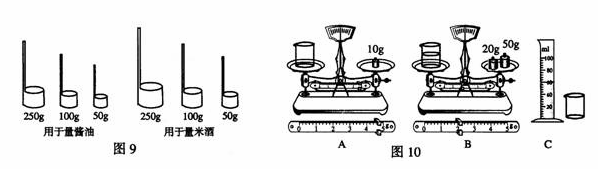 ⑵小明在古镇买了一瓶米酒。回家后,按图 10所示A一B一C的顺序进行了实验,测出了米酒的密度。由图10所示数据求得米酒的密度为 kg/ m3。