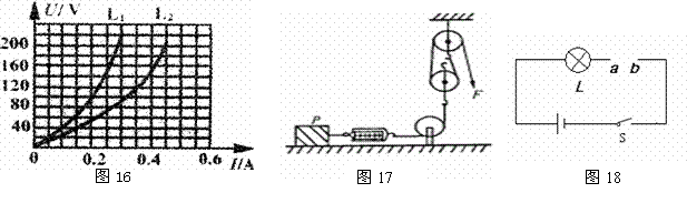 20. 图16分别是两个灯泡L1、L2的U-I图象。由这两条曲线可知,当电压为40V时,L1的电阻为_____Ω, L2的实际功率是________W。在确保电路安全的前提下,将灯泡L1、L2串联在电路中,则_____更亮(选填L1或L2)