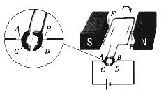 如图所示,在直流电动机的工作过程中,“换向器”起了关键的作用,它能使线圈刚刚转过平衡位置时就自动改变线圈中的__________,从而实现通电线圈在磁场中的连续转动。电动机工作时是把电能转化为______能。