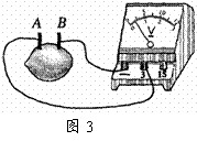 把两种不同的金属片插入柠檬,制成“水果电池”.用电压表测量水果电池的电压,如图3所示.下列说法错误的是: