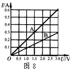 在某一温度下,两个A和B电阻中的电流与其两端电压的关系如图8所示。则由图可知,元件A的电阻为 Ω;将A和B并联后,测得电阻B两端的电压为2V,则干路上的总电流是 A。