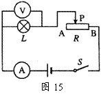 (13分)实验室中要测量一只阻值约1kΩ的电阻。能提供的器材有:干电池两节、学生用电压表(量程为0~3V、0~15V)、学生用电流表(量程为0~0.6A、0~3A)、滑动变阻器(100Ω 2A)和电阻箱(0~9999Ω 2A,符号: )各一只、开关、导线若干。小明选择了设当器材,设计的电路如图16所示,