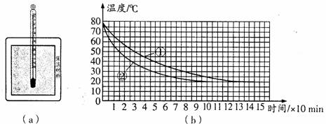 小王同学做“比较两种材料保温性能”的实验,他取①和②两种保温材料,两支相同的温度计,两个相同的大玻璃烧杯,钟表和初温相同、质量相等的热开水,以及细线、硬纸片、剪刀等,做两个外形相同的保温装置,其中一个如右图(a)所示,然后在相同环境的房间里同时开始做实验,他根据测得的数据绘得如右图(b)所示的“水温与时间关系”图像,实验过程中室温保持不变,请你回答: