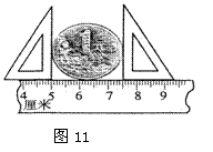 18、(1)小明手上有一个1元硬币,他对小刚说,这个硬币的直径应该怎么测量呢?小刚是这样做的,如图11,小刚使用的长度的常用测量工具是 ,这个硬币的直径是 。